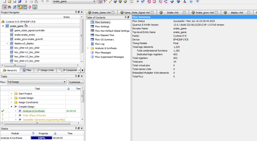 代码实现思路: 整体采用模块化设计,将游戏逻辑、显示控制、按键去抖、得分显示及随机食物生成等功能拆分为独立模块,模块间通过信号总线交互。主控实体 snake_game 负责时钟分频、按键去抖和模块实例化;snake 模块维护蛇身位置数组并实现移动、方向转换、碰撞检测与增长逻辑;snake_grow 采用伪随机数生成食物坐标并在检测到吃到食物时输出增长脉冲;vga_ctrl 将逻辑网格映射到像素坐标并生成 VGA 时序与颜色输出;display 与 BCD 模块负责将分数转换并驱动数码管;game_state_signal 管理游戏状态机(开始、游戏、死亡、重启)并生成死亡闪烁与重启脉冲。全局时序以 25 MHz 的 VGA 时钟为基准,游戏移动速率通过内部计数器与速度模式控制实现,可通过按键循环改变速度。