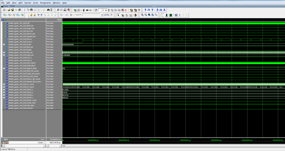 代码功能: 实现一款在 VGA 显示器上运行的“贪食蛇”游戏,支持按键控制方向与速度切换,包含食物生成、吃食增长、撞墙/自撞判定、得分显示与死亡闪烁效果,使用数码管显示得分,并通过 LED/蜂鸣器提供简单反馈。