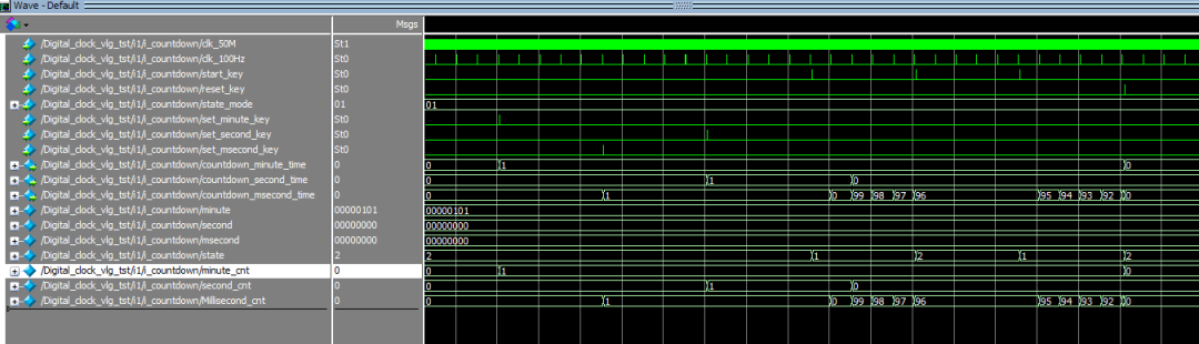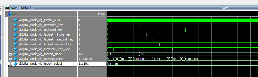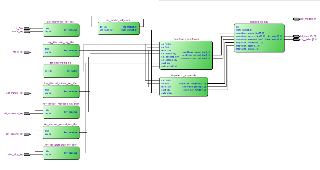 module Digital_clock( input clk_50M, input start_stop_key,//跑表启动,暂停 input reset_key,//跑表复位 input mode_key,//模式按键 input set_minute_key,//设置时间 input set_second_key,//确认 input set_msecond_key,//设置时分秒 output [1:0] led_mode,//led显示当前模式 output [5:0] bit_select,//数码管位选 output [7:0] seg_select//数码管段选 ); wire [7:0] stopwatch_Millisecond;//10毫秒 wire [7:0] stopwatch_second;//秒 wire [7:0] stopwatch_minute;//分 wire [7:0] countdown_hour_time;//时 wire [7:0] countdown_minute_time;//分 wire [7:0] countdown_second_time;//秒 wire start_stop_key_negedge; wire reset_key_negedge; wire mode_key_negedge; wire set_minute_key_negedge; wire set_second_key_negedge; wire set_msecond_key_negedge; wire [1:0] state_mode;//当前模式,4'd0:正计时,4'd1:倒计时 wire clk_100Hz; //分频模块 fenping fenping_Hz( . clk_50M(clk_50M), . clk_100Hz(clk_100Hz)//分频到100Hz );