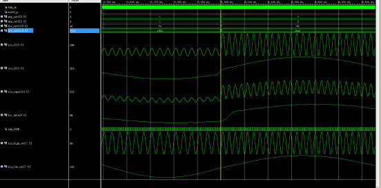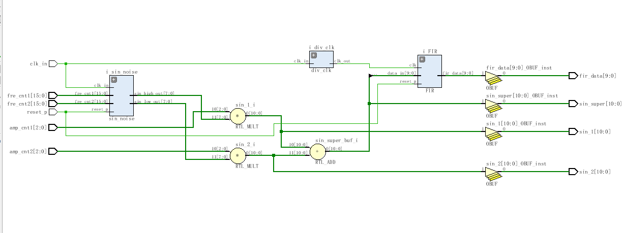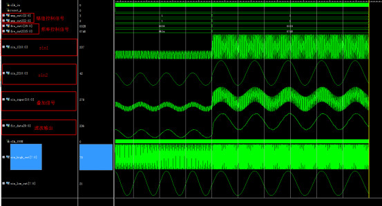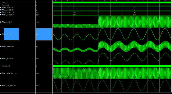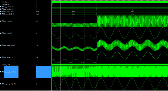 //滤波器 module FIR_filter( input clk_in,//50MHz input reset_p,//高电平复位 input [2:0]amp_cnt1,//幅值控制信号1--值越大输出幅值越高 input [2:0]amp_cnt2,//幅值控制信号2--值越大输出幅值越高 input [15:0]fre_cnt1,//频率控制信号1--值越大输出频率越低 input [15:0]fre_cnt2,//频率控制信号2--值越大输出频率越低 output [10:0] sin_1,//输出频率1 output [10:0] sin_2,//输出频率2 output [10:0] sin_super,//叠加信号 output [9:0] fir_data//滤波后结果 ); wire [10:0] sin_super_buf; wire clk_100K; //分频模块,50M分频到100K div_clk i_div_clk( . clk_in(clk_in), . clk_out(clk_100K) ); wire [7:0] sin_high_out;//输出频率1 wire [7:0] sin_low_out;//输出频率2 //产生带噪声的正弦波 sin_noise i_sin_noise( . clk_in(clk_in),//50MHz . reset_p(reset_p),//高电平复位 . fre_cnt1(fre_cnt1),//频率控制信号1--值越大输出频率越低 . fre_cnt2(fre_cnt2),//频率控制信号2--值越大输出频率越低 . sin_high_out(sin_high_out),//输出频率1 . sin_low_out(sin_low_out)//输出频率2 ); //8阶线性相位结构FIR FIR i_FIR( . clk(clk_100K),//100K . reset_p(reset_p),//高电平复位 . data_in(sin_super_buf[10:1]),//带噪声的正弦波 . fir_data(fir_data)//滤波后结果 ); assign sin_1=amp_cnt1*sin_high_out;//输出频率1 assign sin_2=amp_cnt2*sin_low_out;//输出频率2 assign sin_super_buf=amp_cnt1*sin_high_out+amp_cnt2*sin_low_out;//叠加信号 assign sin_super=sin_super_buf; endmodule